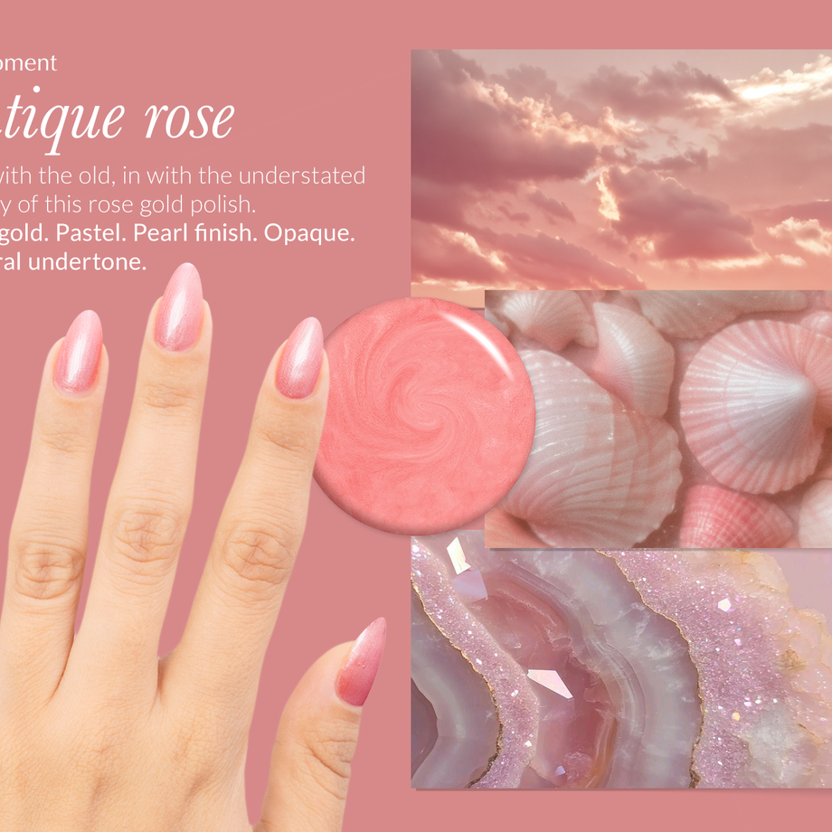 Rose gold. Pastel. Pearl finish. Opaque. Neutral undertone.